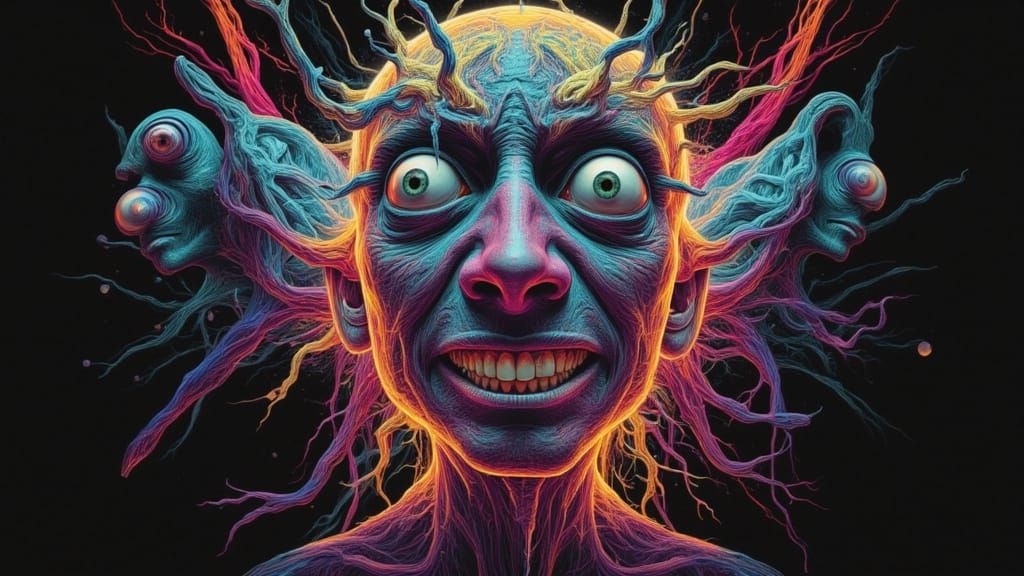 This image shows a hyperrealistic, detailed depiction of a mutated, grinning man with fractal facial features. It features a rainbow dreamscape and elements of horror fantasy art.