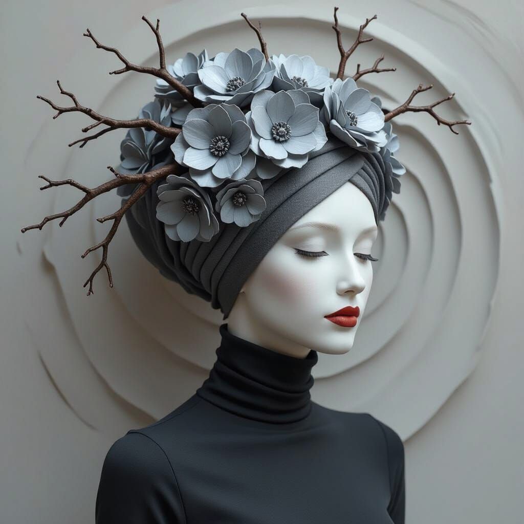 A striking picture of a faceless woman in a charcoal dress with sculptural hair. The hair turban features twisted branches and gradient grey flowers with silver and copper patina, in a textured, naive art style.