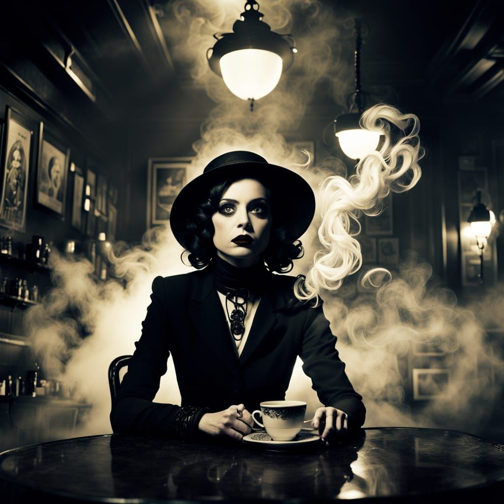 This image shows a goth fashion model in a dark, moody coffee shop. The scene is filled with mist and smoke, illuminated by dim golden light, creating a vintage film noir aesthetic.