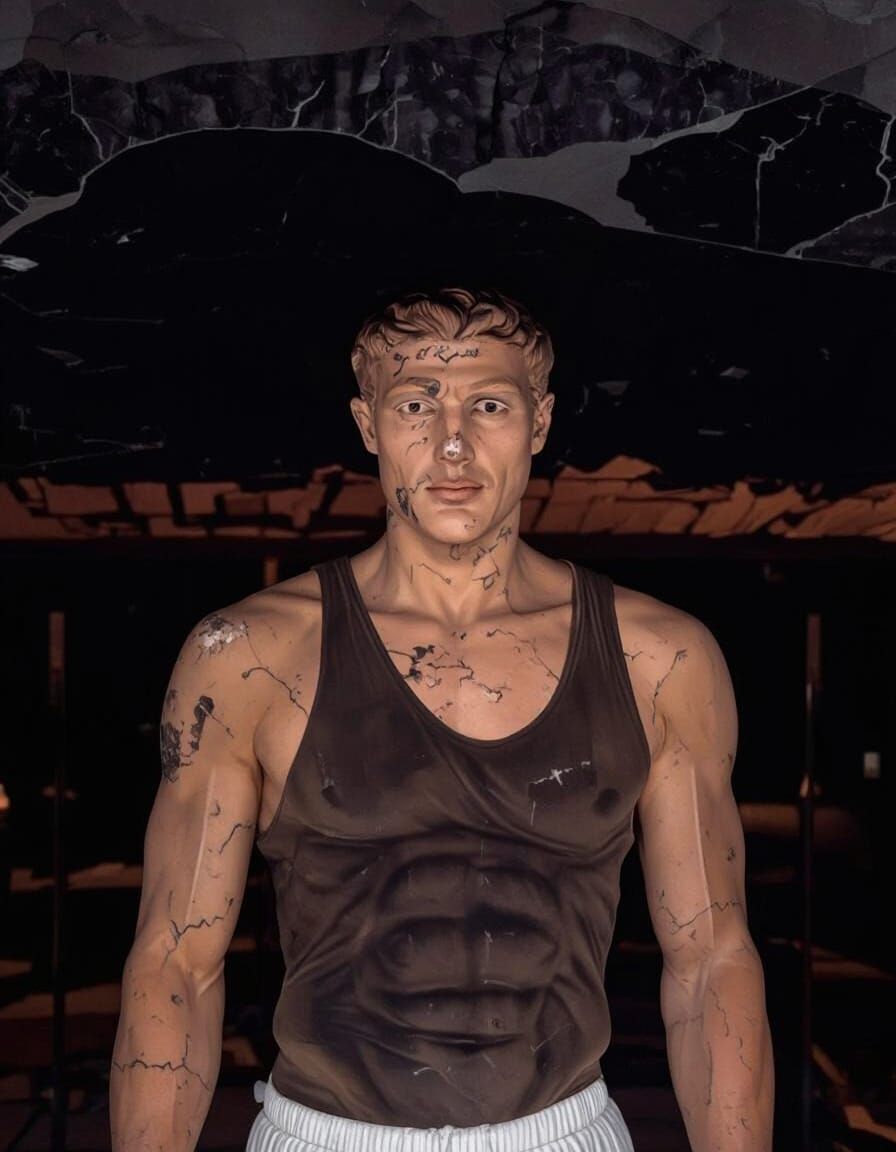 This image shows a person depicted as a classical marble statue. The photorealistic rendering captures the texture of aged stone, complete with chisel marks and soft lighting.