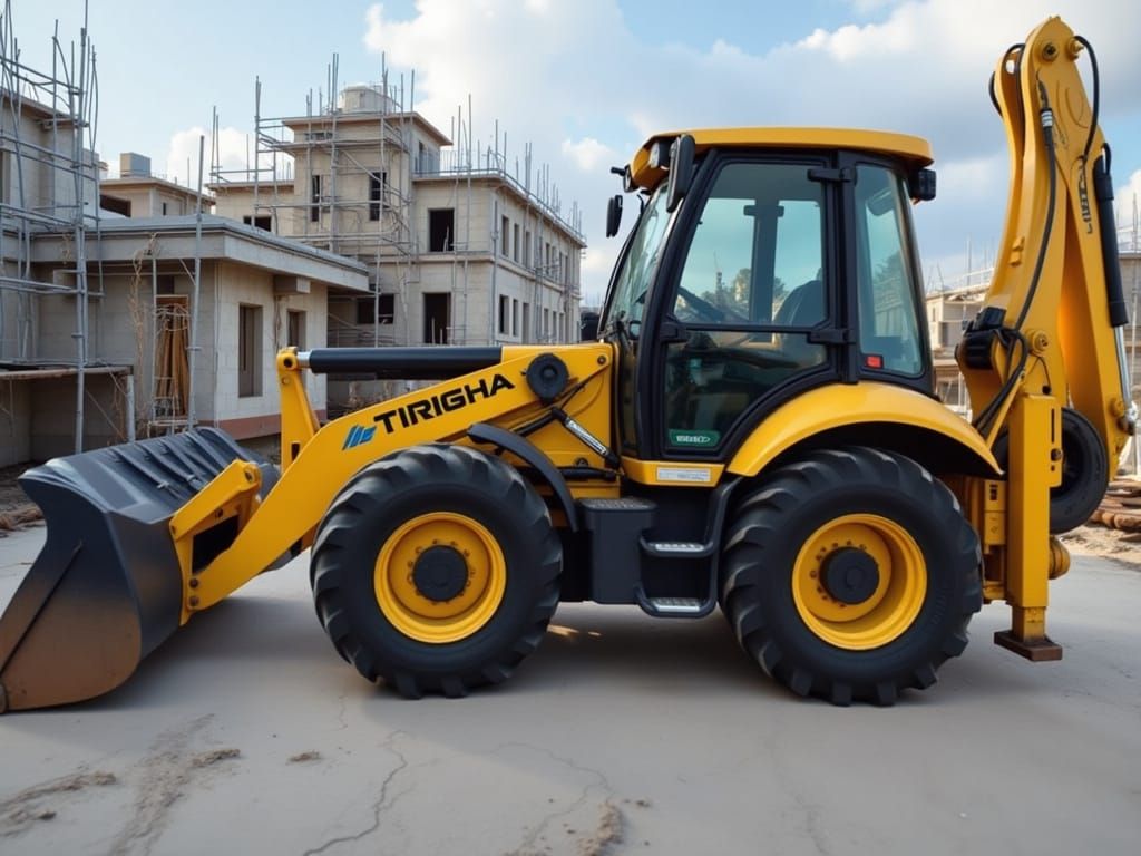This image shows a detailed yellow excavator-loader centered on a construction site. Golden hour lighting creates dramatic shadows and a sense of industrious energy. Rendered in a detailed concept art style.