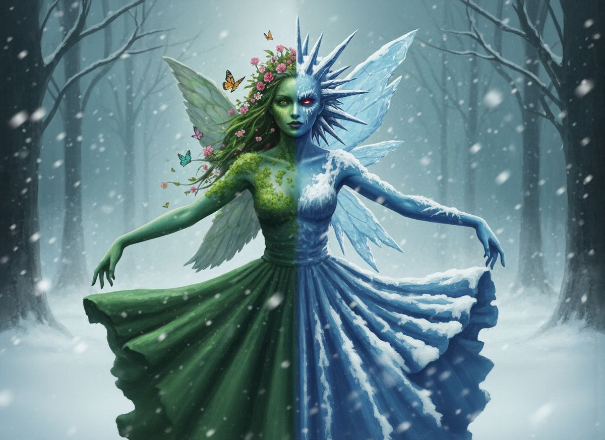 This image shows a surreal double exposure portrait of a fairy woman. One side embodies nature with moss and flowers, while the other is a menacing ice queen, set in a contrasting forest landscape with a glitchcore aesthetic.