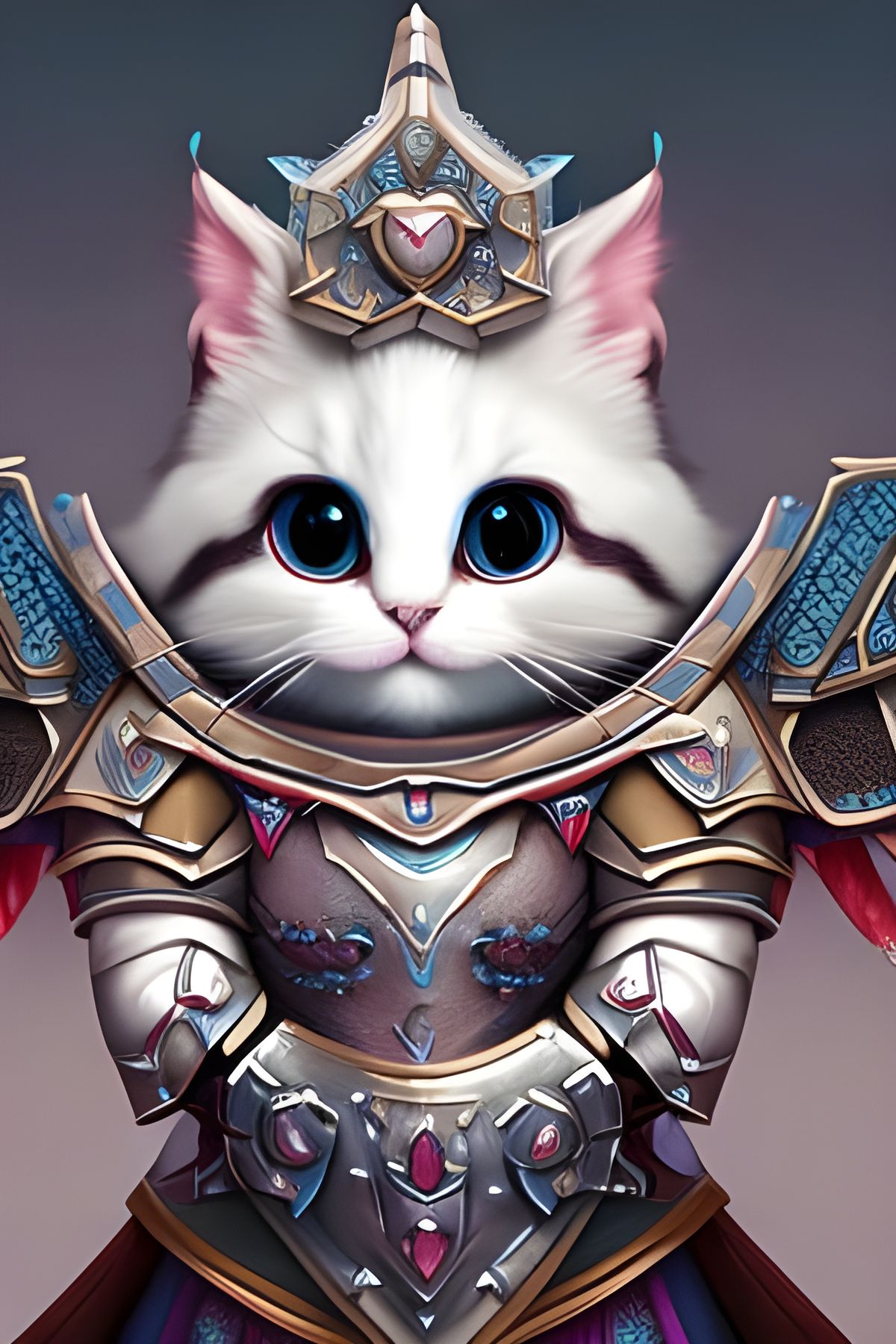 A digital illustration of an adorable ragdoll kitten cleric in ornamented silver armour. The character design features a detailed background and is rendered as 3D in 8K resolution.