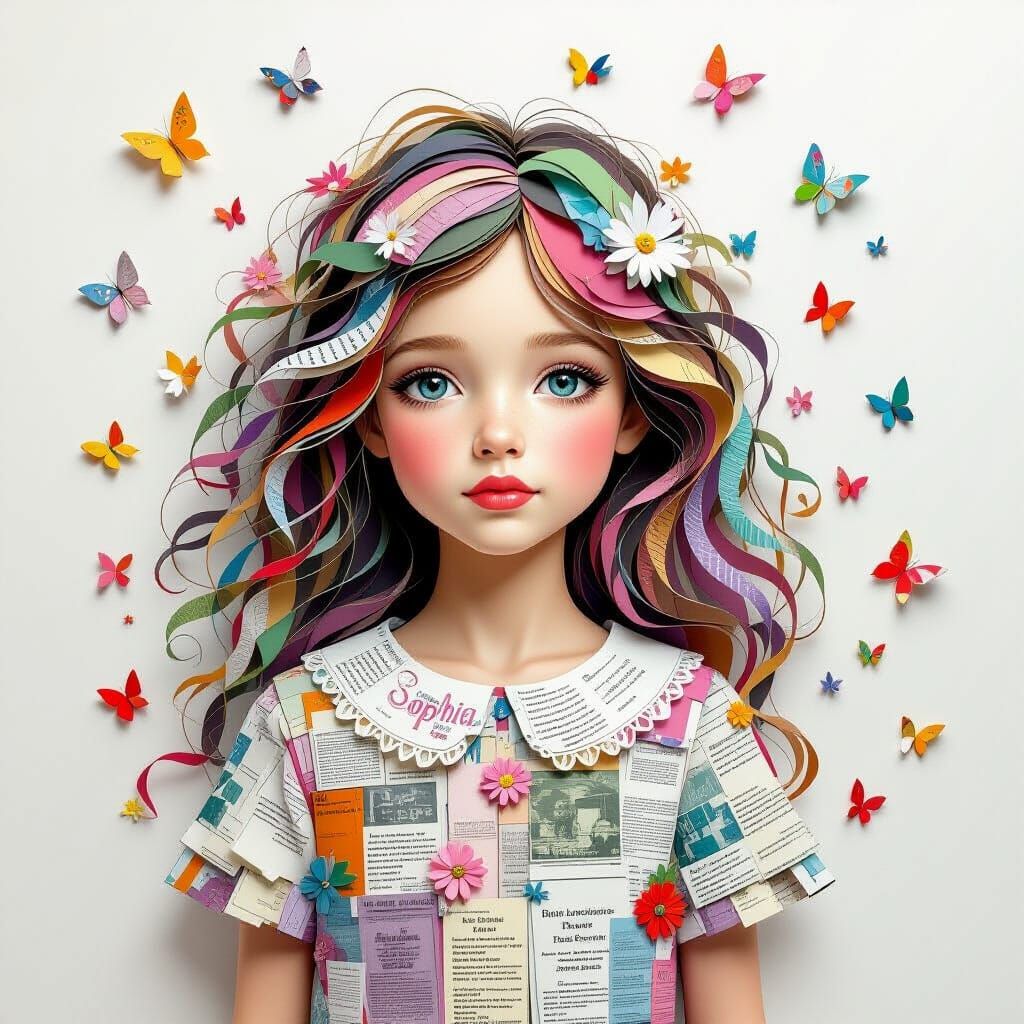 This image shows an ethereal girl constructed from colorful paper scraps. The artfully arranged pieces include handwritten notes, typed documents, and calendar pages, creating a magical and highly detailed effect.