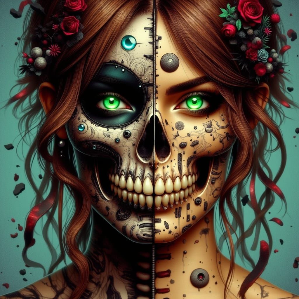 This image shows a woman's face with bright green eyes and a fantasy skull tattoo covering half of it. The artwork blends digital painting with detailed ink illustration.