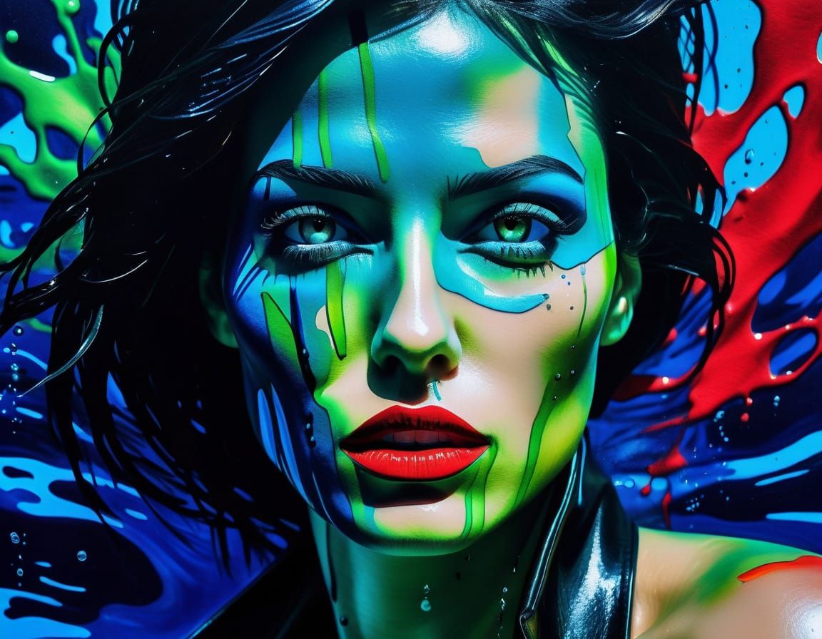 A striking picture of a woman with black hair underwater, rendered in vibrant acrylics. The subject features piercing blue eyes, small neon green lips, and is illuminated by red lightning in an abstract expressionist style.