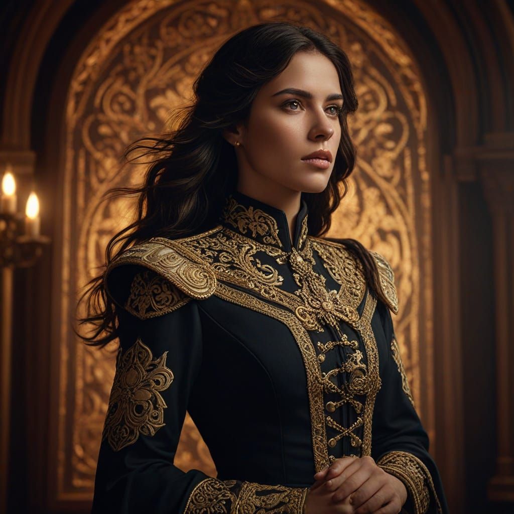 This digital matte painting showcases a beautiful medieval Spanish captain in an ornate uniform. Art Nouveau illustration with dramatic chiaroscuro lighting creates a cinematic fantasy character.