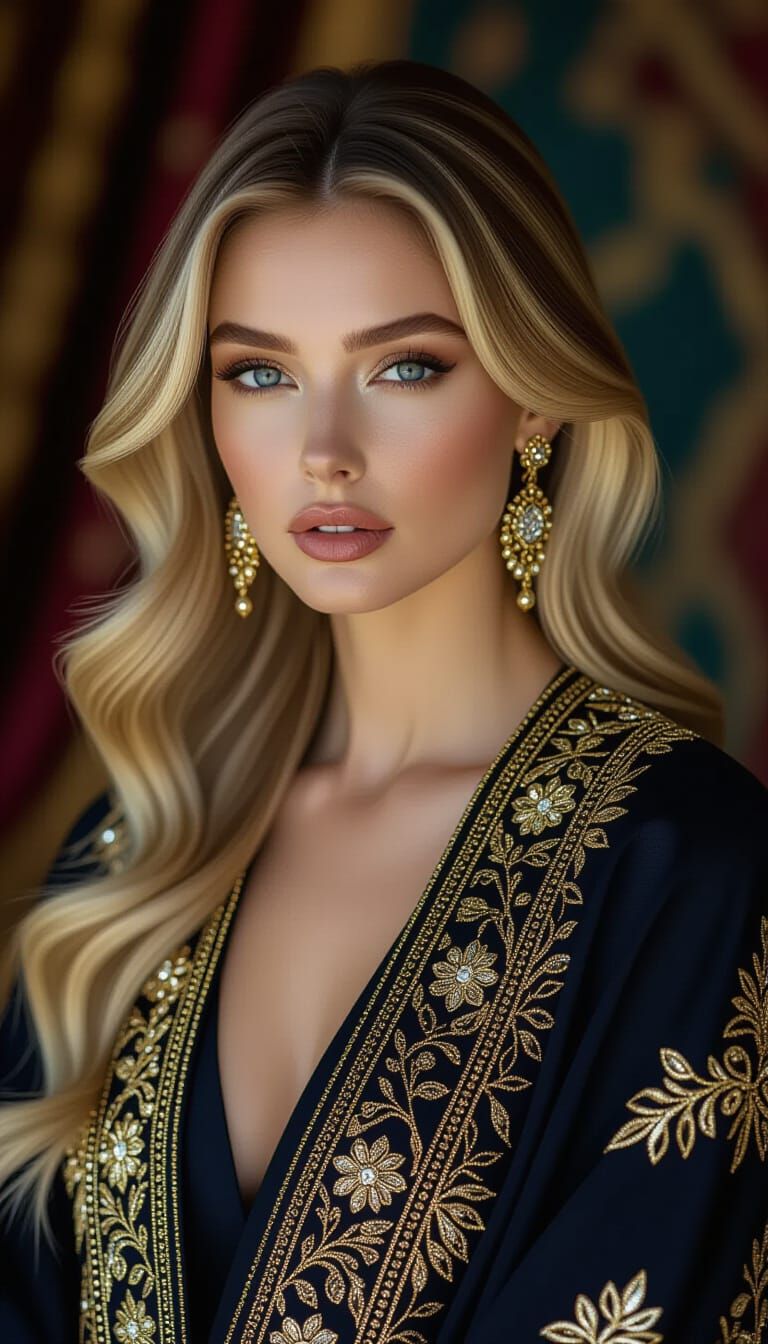 A striking picture of a blonde businesswoman wearing a gold-embroidered abaya. The image, in a cinematic style, evokes elegance and luxury against an opulent backdrop with vibrant fabrics. The style is reminiscent of haute couture.