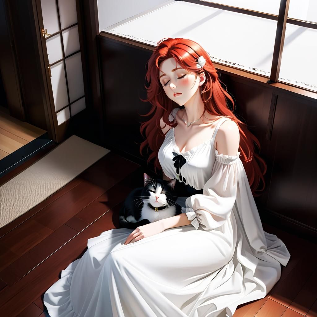 A digital anime illustration of a passed-out woman being nudged by a tuxedo cat. The artwork is cel-shaded and evokes the style of Studio Trigger in a luxury Japanese apartment.