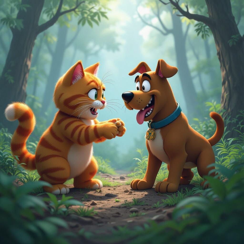 A digital rendering of Garfield and Scooby Doo locked in combat within a lush forest. The image features anime-style exaggerations, rich textures, dramatic 3D lighting and shadows.