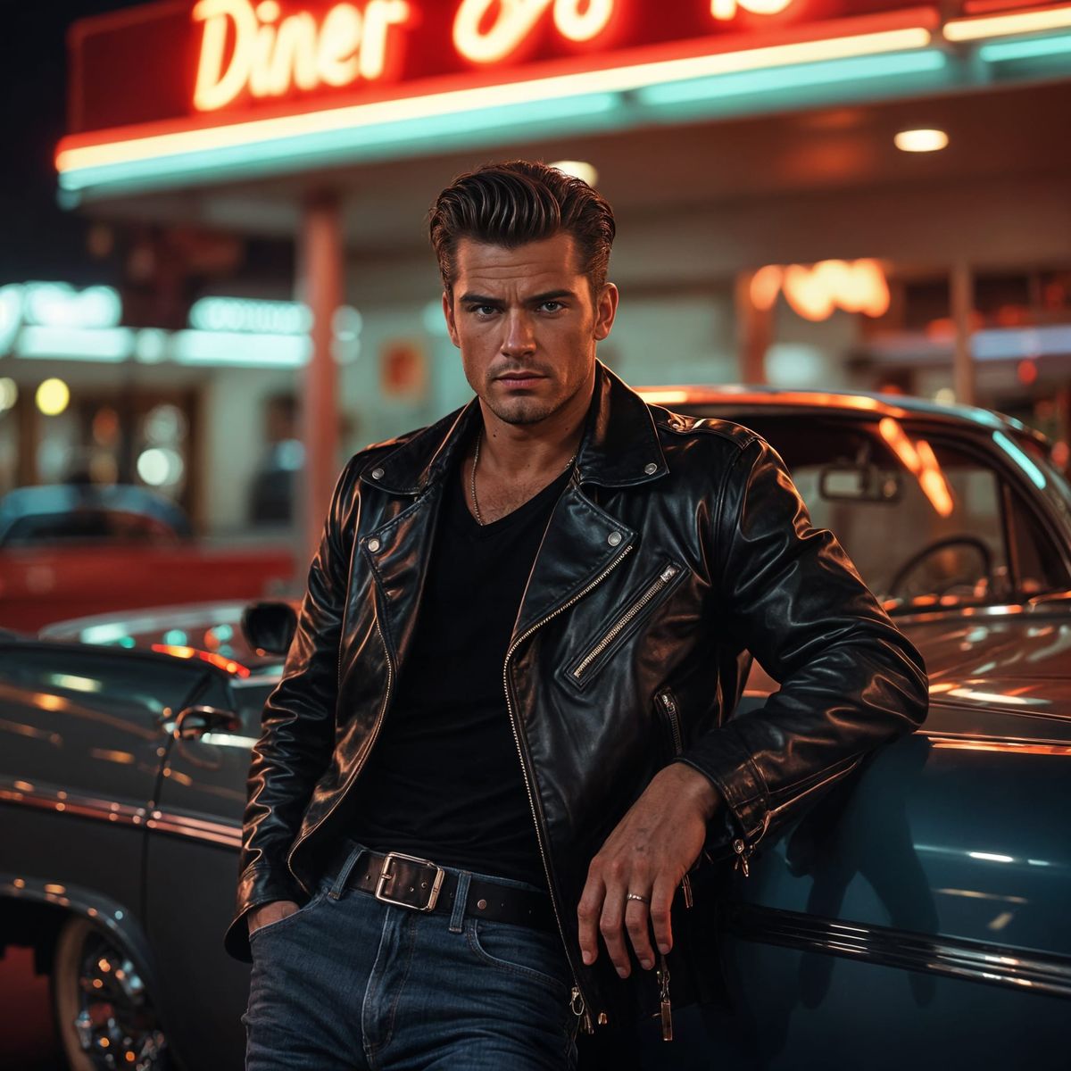 A greaser poses by a vintage car in a retro diner scene. The image, reminiscent of classic travel photography, captures the scene's authenticity with vintage film grain and warm color grading.