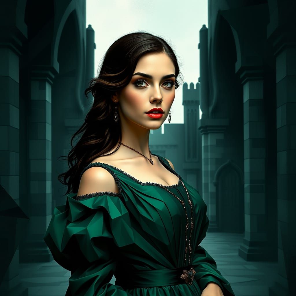 A monochrome image of a brunette woman in a medieval emerald dress, posing inside a mysterious castle. The portrait is rendered in a cubist style, with geometric and art deco elements.