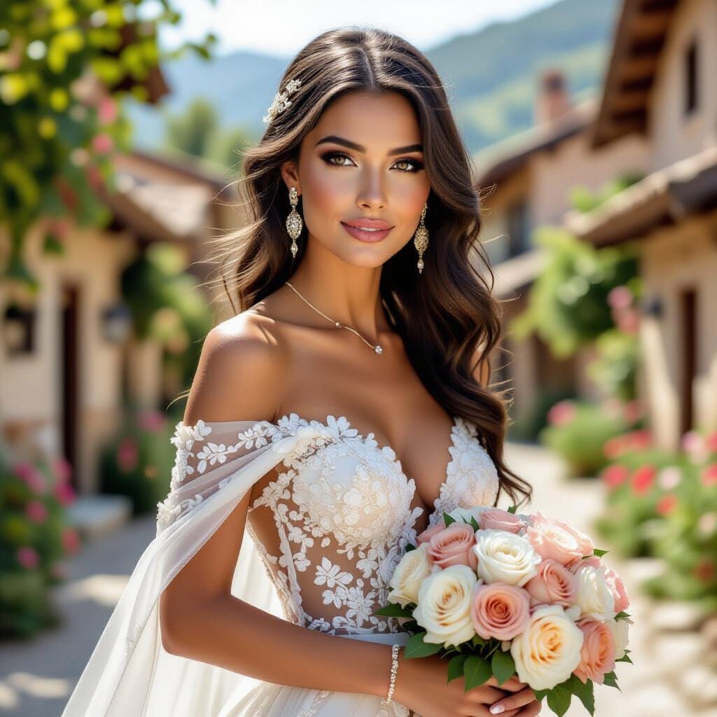 This image shows a woman in a white gown with gold embroidery, holding a bouquet of light pink roses. The background shows a rustic village in a painterly style.