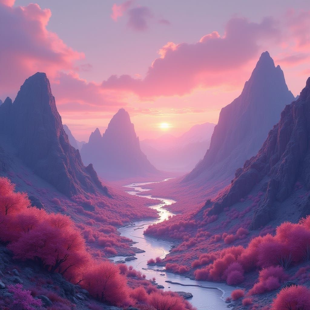 This image shows a stunning mauve planet with rugged mountains, deep valleys, and snow-capped peaks, blending fantasy and realism with a focus on atmospheric texture and vibrant color, evoking a sense of mystery and solitude