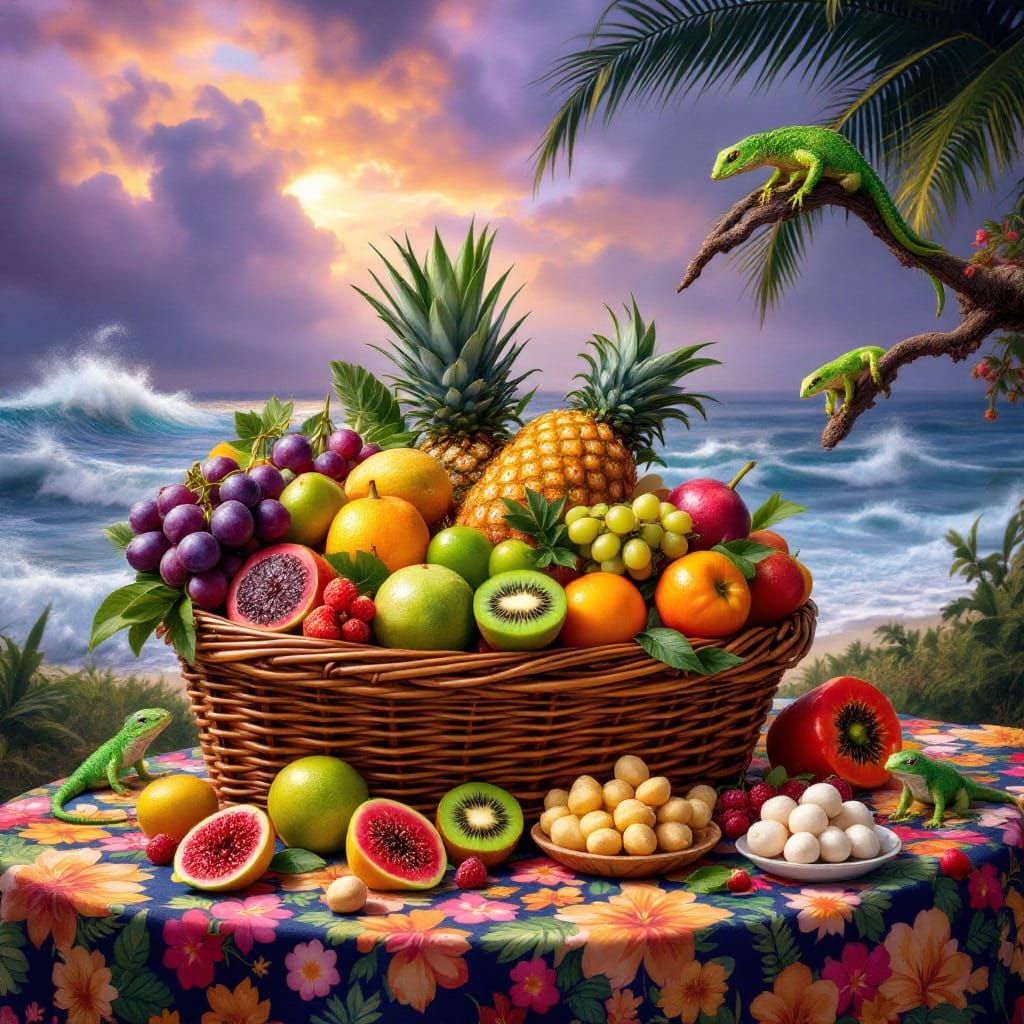 A wicker basket brimming with figs, papaya, dragon fruit, kiwi, pineapple, and lychee. Set on a picnic table with a Hawaiian cloth under a stormy, colorful sky.