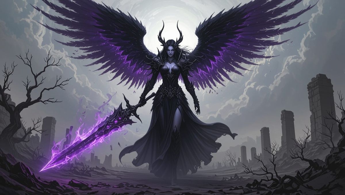This image shows a powerful death angel descending from the heavens, surrounded by a desolate landscape of twisted trees and crumbling ruins. Rendered in a dark fantasy style with dramatic lighting and cosmic horror elements.