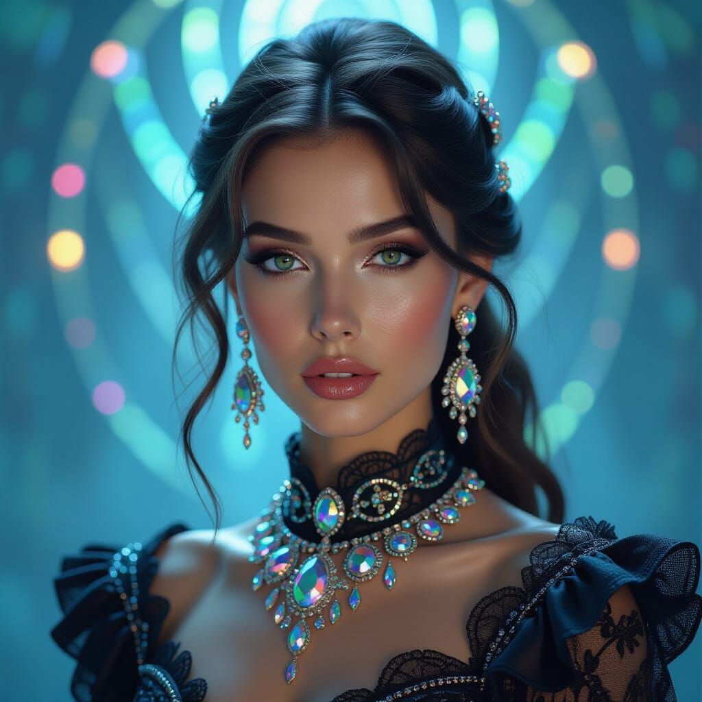 Hyperrealistic full body portrait of a beautiful woman adorned with intricate, futuristic jewelry, bathed in ethereal, volumetric light. The style combines sharp, high-definition detail with a touch of surrealism, akin to the works of H.R. Giger and Zdzisลaw Beksiลski, emphasizing form and light through ...