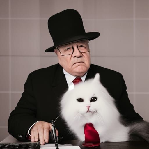 A portrait of an elderly mafia boss in a black suit, red tie and fedora, face shadowed. A fluffy cat sits on his lap as he pets it, as digital art.