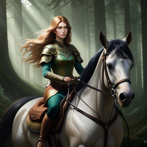 This digital painting captures a close-up of a woman riding a horse through a sun-dappled forest. Dramatic lighting and rich textures enhance the fantasy art composition.