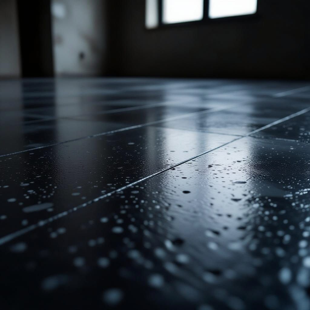 This image presents a highly detailed, cinematic view of black and grey epoxy flooring. Shot with dramatic lighting and atmospheric depth, it emphasizes realistic textures and visual quality.