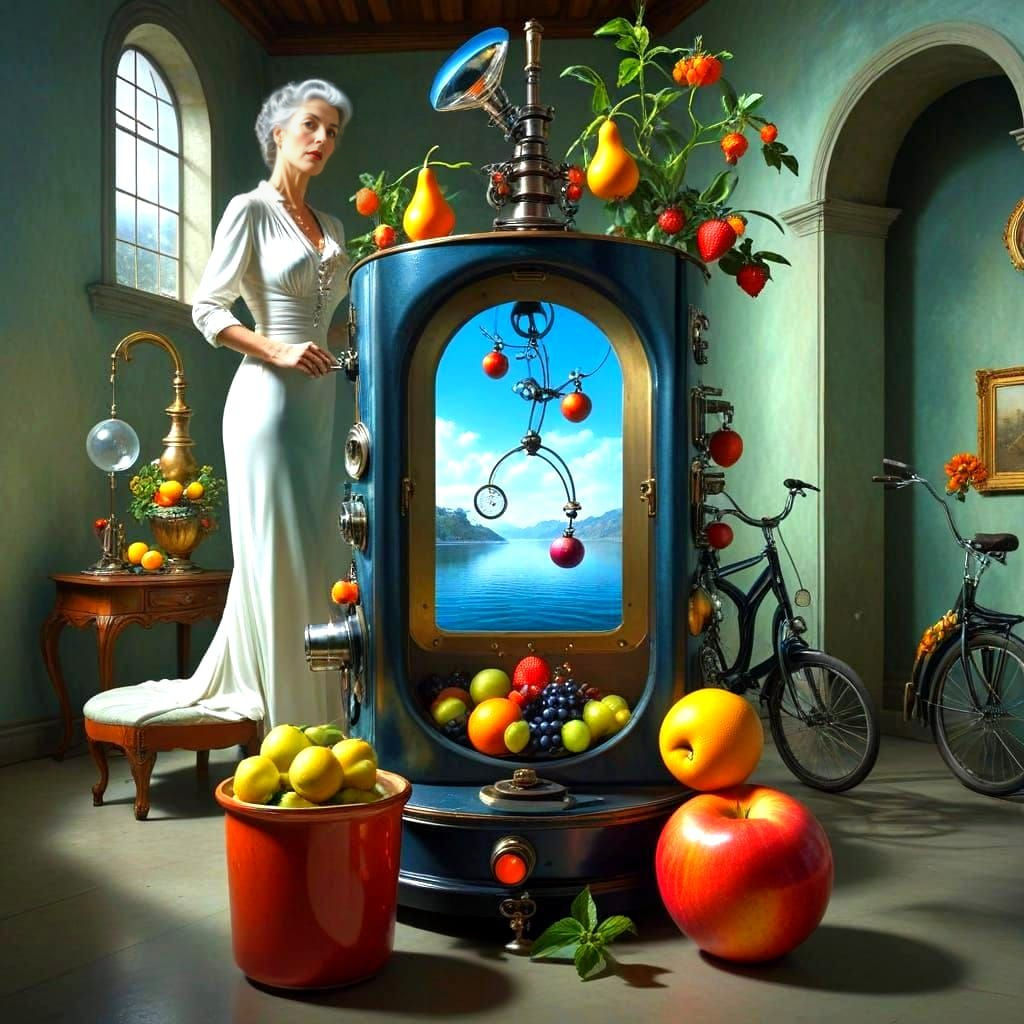 beautiful extravagantly dressed mature lady in stunning fantastic surreal scene; photographically rendered charming expressive face, active motion, highly dynamic posture, realistically depicted harmless fantastic fauna and flora, hyperrealistic fantastic fruit, complex fantastic retrofuturistic scientific ...