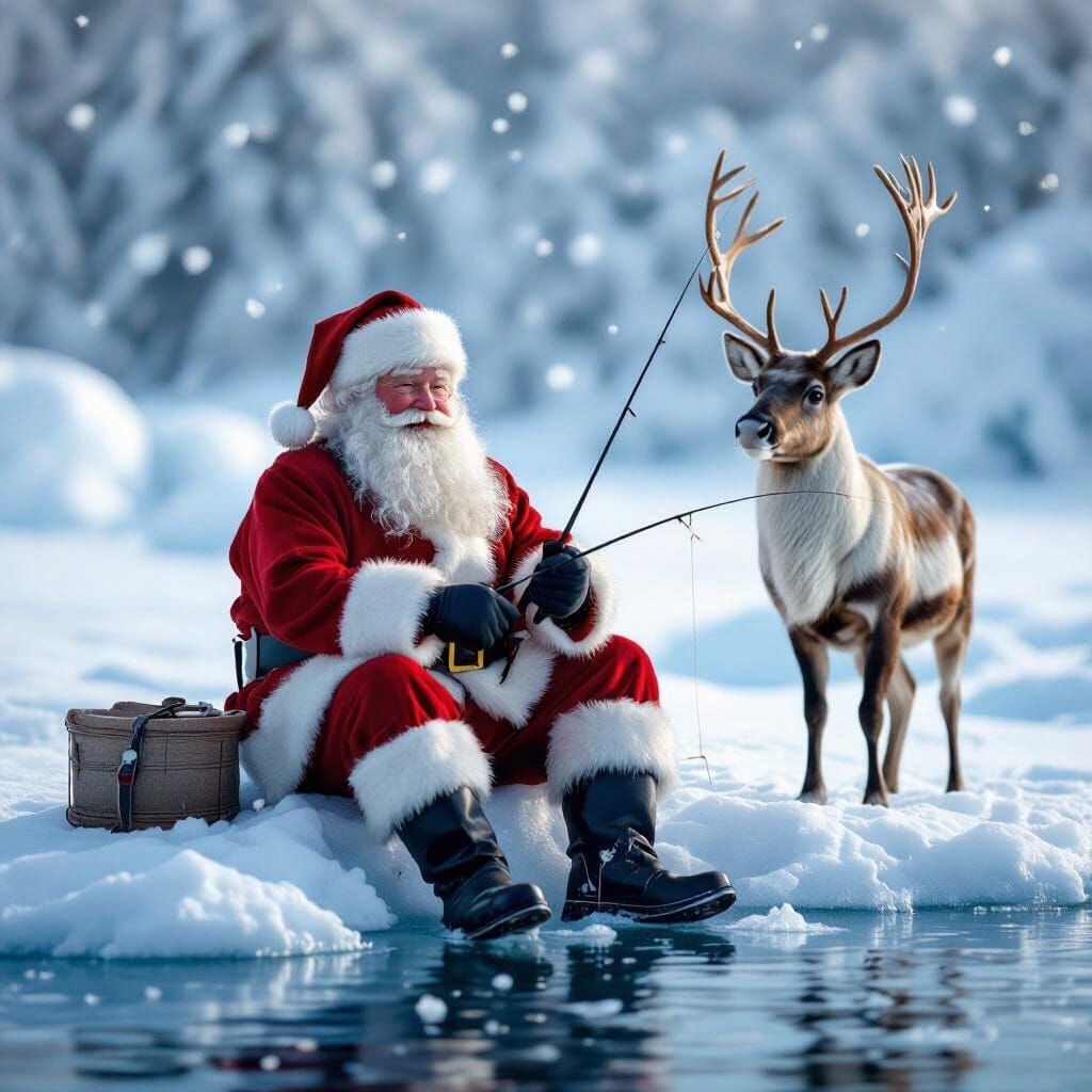 Generate unique images of Santa fishing with reindeer for free. Easy and fun AI image creation!