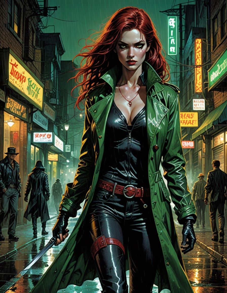 This image features an athletic vampire hunter with dark red hair and a determined gaze, walking through 1970s Los Angeles at night. The style evokes a dark, atmospheric feel.