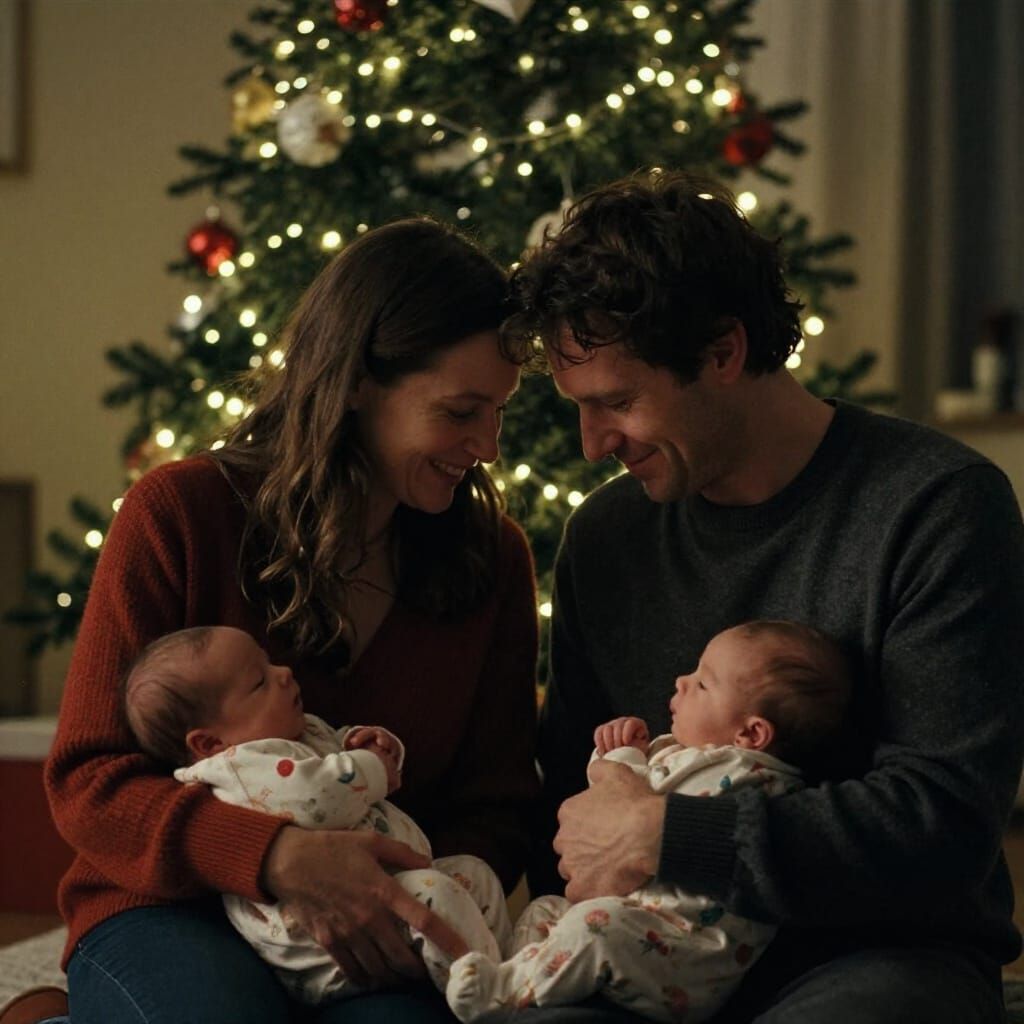 A cinematic film still capturing the intimate moment loving parents welcome newborn twins on Christmas Day, bathed in fairy light glow. Evokes profound love and connection.