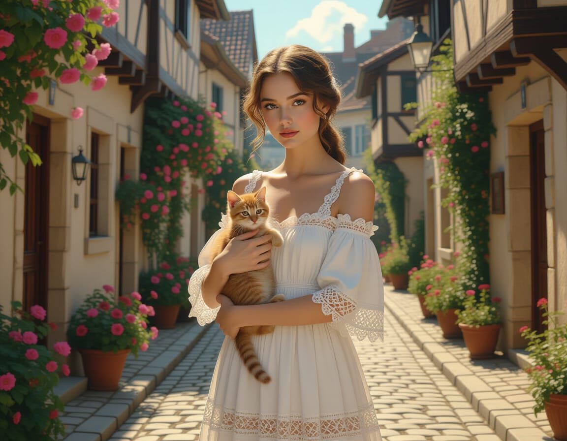 This image shows a young woman in a floral dress holding a kitten on a cobblestone street. The scene is full of lush greenery and historic buildings, rendered with cinematic realism.