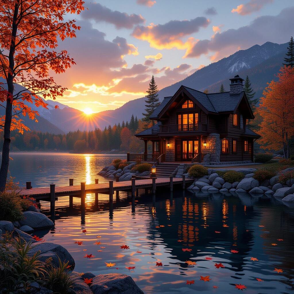 A two-story mahogany and porcelain lodge rests by a lake reflecting a vibrant sunset and a second sun. Autumn leaves drift on the breeze, with mountains in the background. Cinematic, hyperrealistic style.