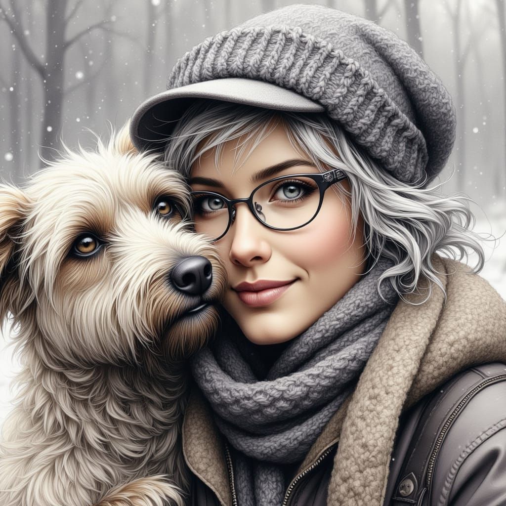 This image shows a cheerful old woman with silver hair and glasses, bundled for winter, being nuzzled by her scruffy English Sheepdog amidst a heavy snowfall. Rendered in a textured, painterly folk art style.