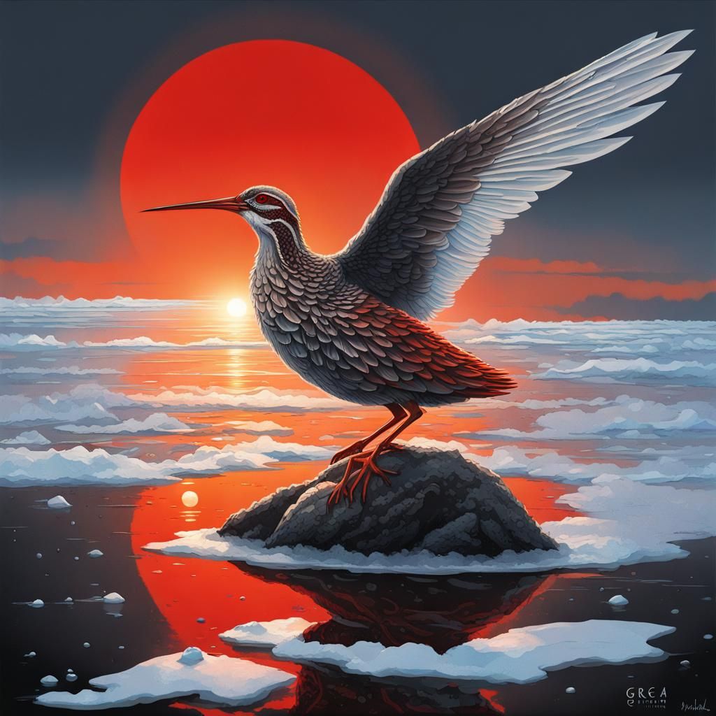 A striking picture of a snipe bird attacking a giant silver oyster on a black sand beach. The artwork is rendered with red and orange rain, blue snow and K-pop aesthetic.