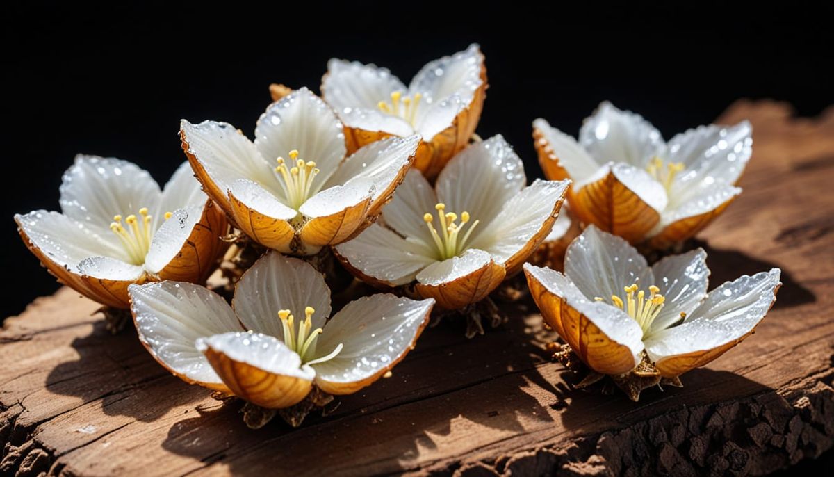 This image shows a cracked mother-of-pearl conch shell, rendered in exquisite detail. Light radiates from its fissures, creating an ethereal, softly glowing effect. The shell appears to be crafted from delicate twigs and dried wood.