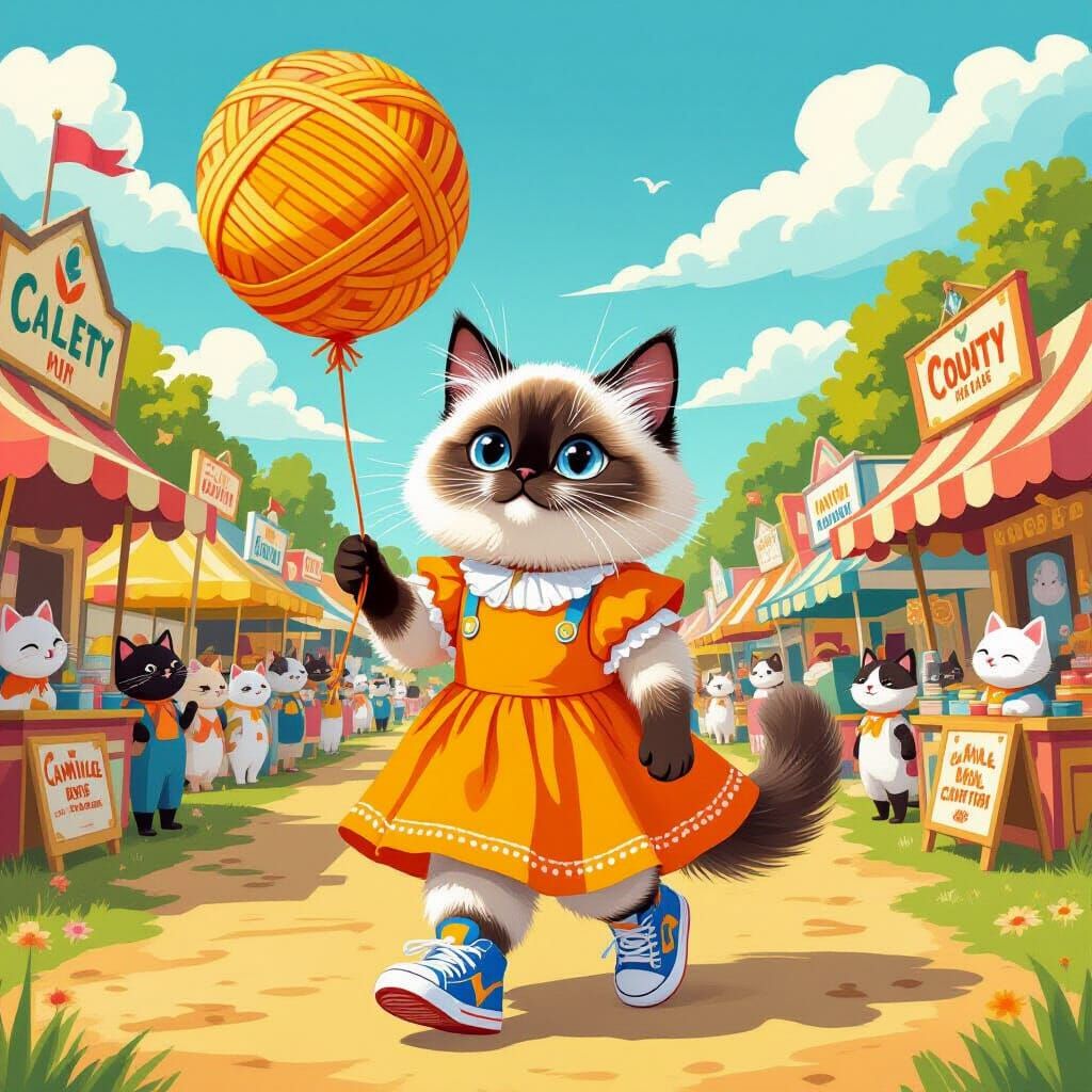 This image shows a Siamese cat in a sundress and sneakers walking through a county fair. The whimsical scene features anthropomorphic cats, stalls, and banners, rendered with bold lines and playful textures.