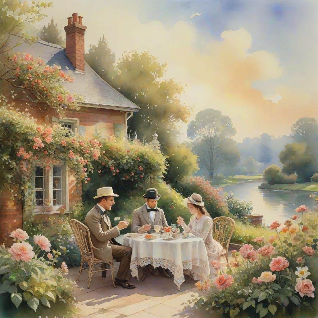 This image shows a Victorian couple enjoying tea in their vibrant garden. The watercolor painting captures a serene and intimate scene with soft focus, warm golden hour lighting, and delicate details.