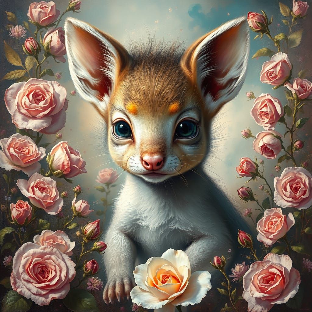 This image showcases a rare, beautiful baby creature in a surreal wonderland filled with roses and flowers. Created with impasto gouache techniques, it evokes a dreamlike, ethereal atmosphere.