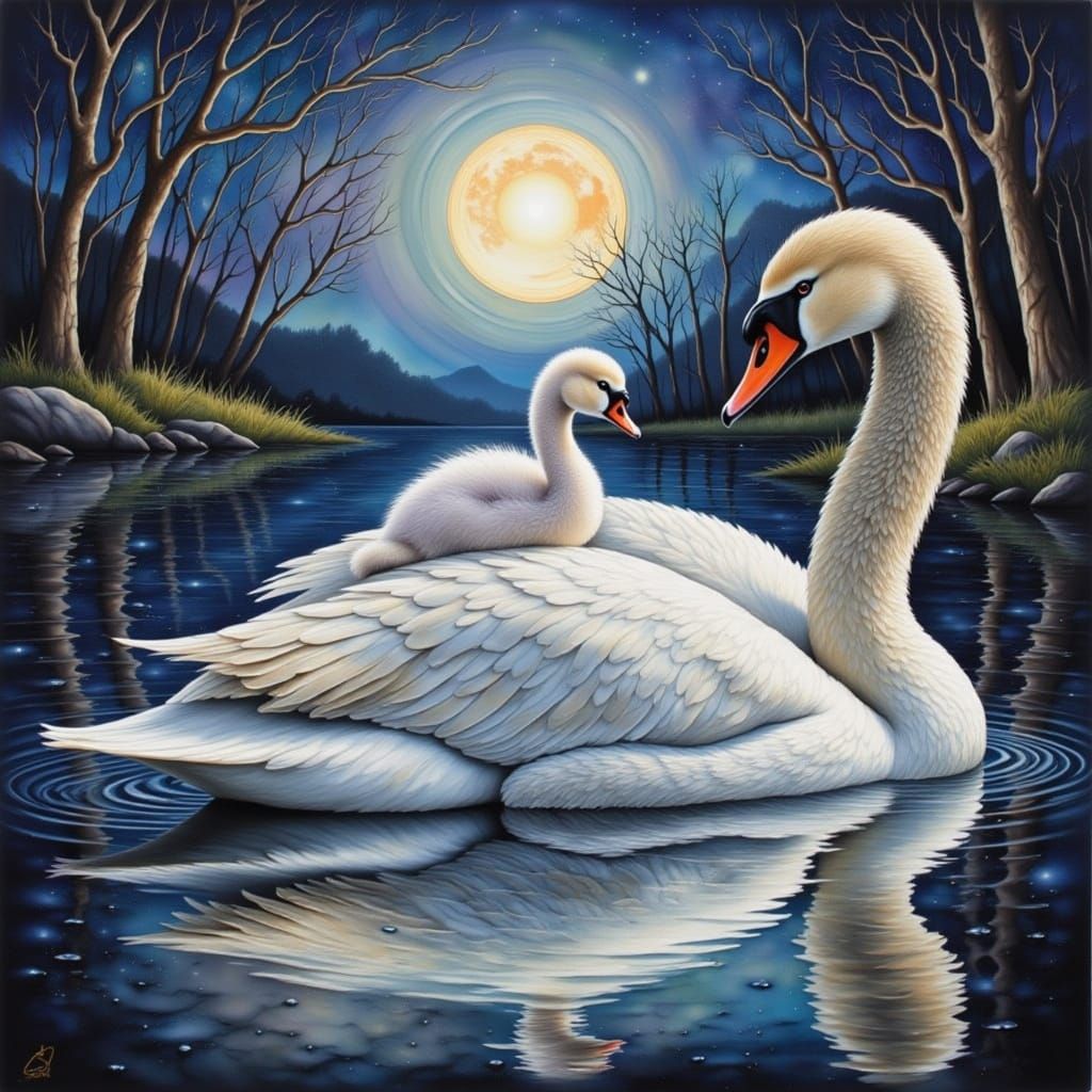 A stylized oil painting captures a serene night scene of a full moon illuminating a lake, with a tiny cygnet nestled on an adult swan's back. Features fine brushstrokes and detailed reflections.