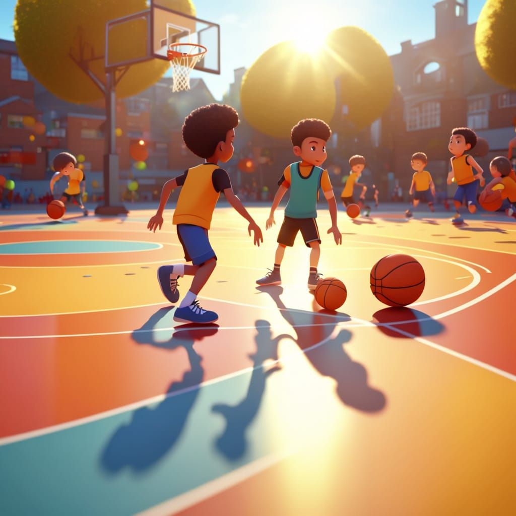 This image shows children playing basketball on an outdoor court, rendered in a vibrant Pixar-style aesthetic. The scene captures the energy of youth with warm golden lighting.