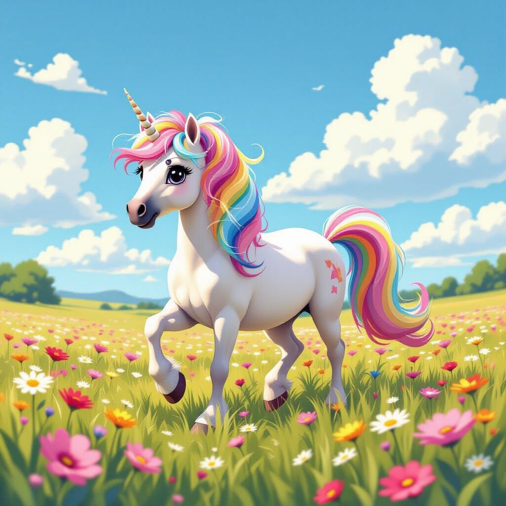 This image showcases a pretty pink pony with a rainbow mane, trotting through a wildflower field under a blue sky. Rendered in a vibrant, cheerful digital painting style with magical lighting.