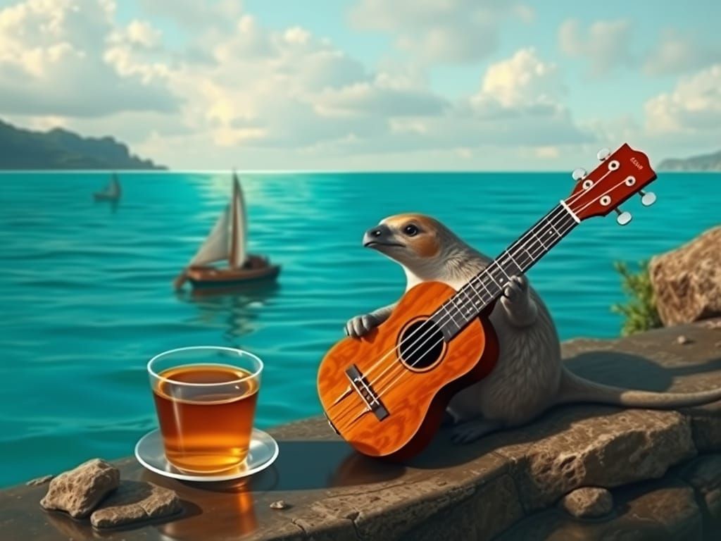 This image shows a platypus playing a ukulele against a seascape backdrop. The artwork is rendered with a tea-stained effect, providing a vintage aesthetic.