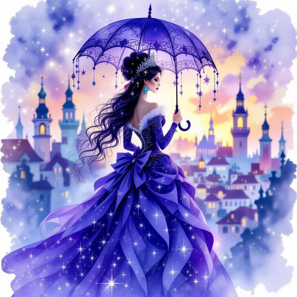 This image features a regal Queen of the Night figure with dark hair, adorned in a starry baroque gown, floating above a city. Rendered in a wet-on-wet watercolor style with intricate details and a magical glow.