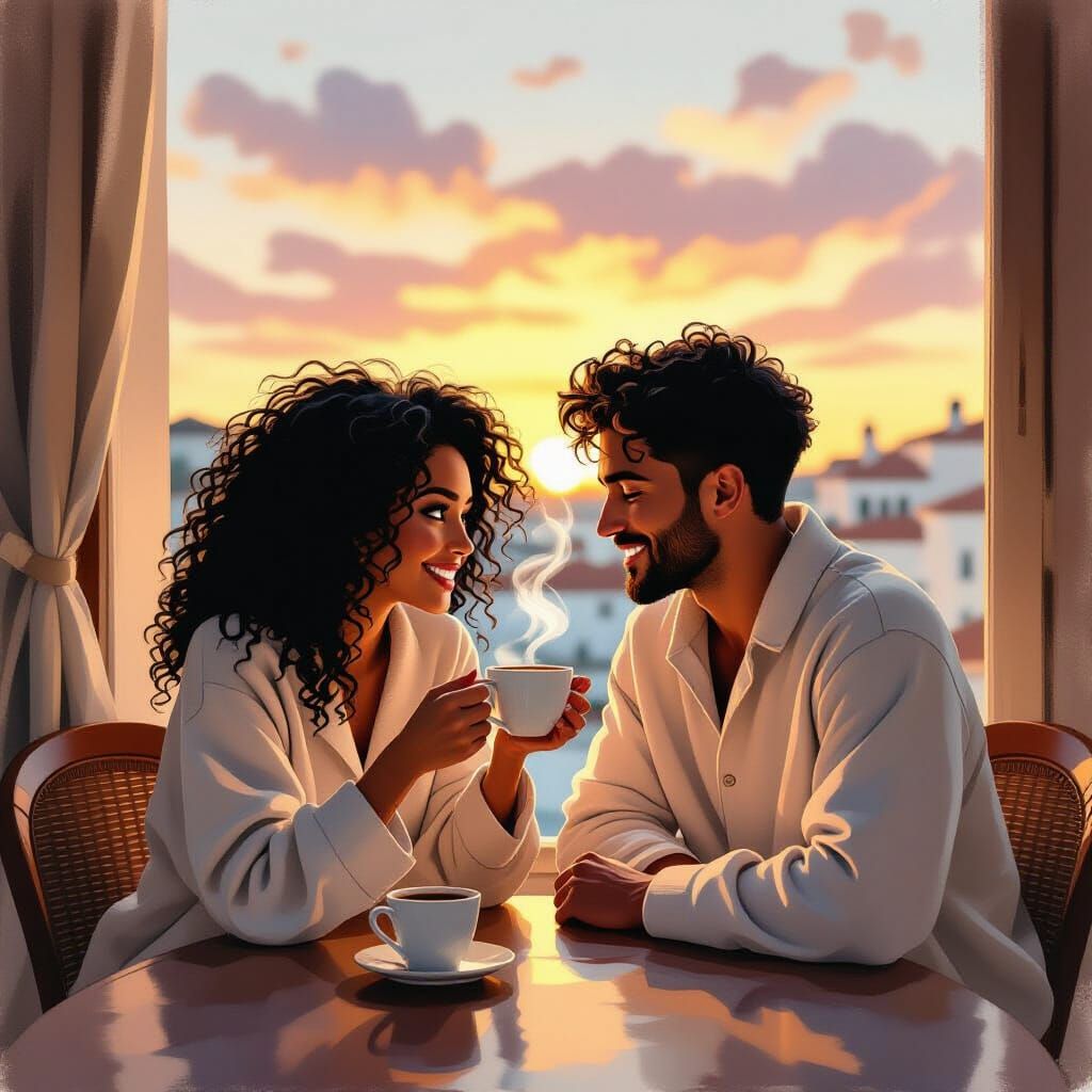 Easily generate unique images of couples in pajamas, enjoying coffee at dawn in Cagliari. Free and simple AI creation.