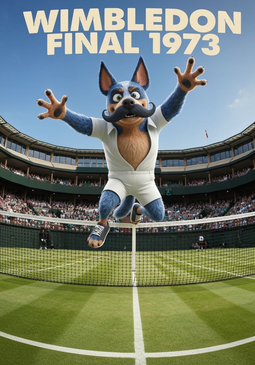 1970s retro throwback anthropomorphic blue heeler wearing white tennis shorts and shirt with enormous droopy moustache leaping over net on Centre Court at Wimbledon CGI character design fantasy art concept art nutty AF photorealism title reads "Wombledon Final 1973"