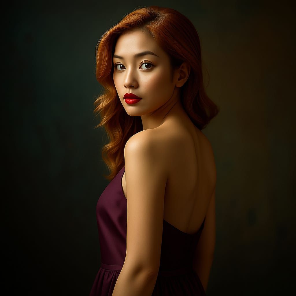 This image features a slender Filipina woman with blonde and red streaked hair, wearing a purple silk gown. The portrait evokes classic oil paintings with dramatic lighting and a smoldering gaze.