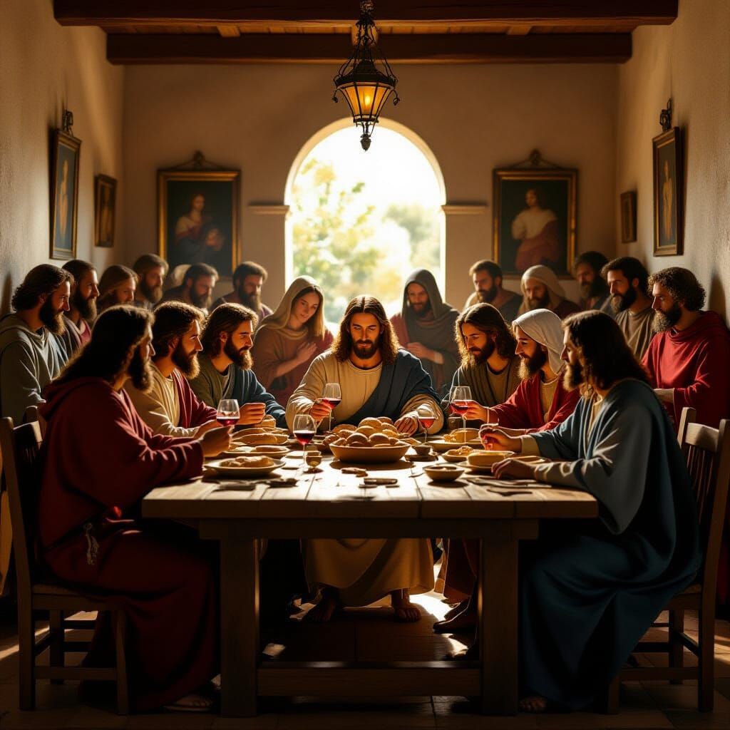 This image shows Jesus and his disciples sharing a meal of wine and bread. The scene evokes a Renaissance painting with harmonious composition, dramatic lighting, and vivid colors, depicting other biblical figures.
