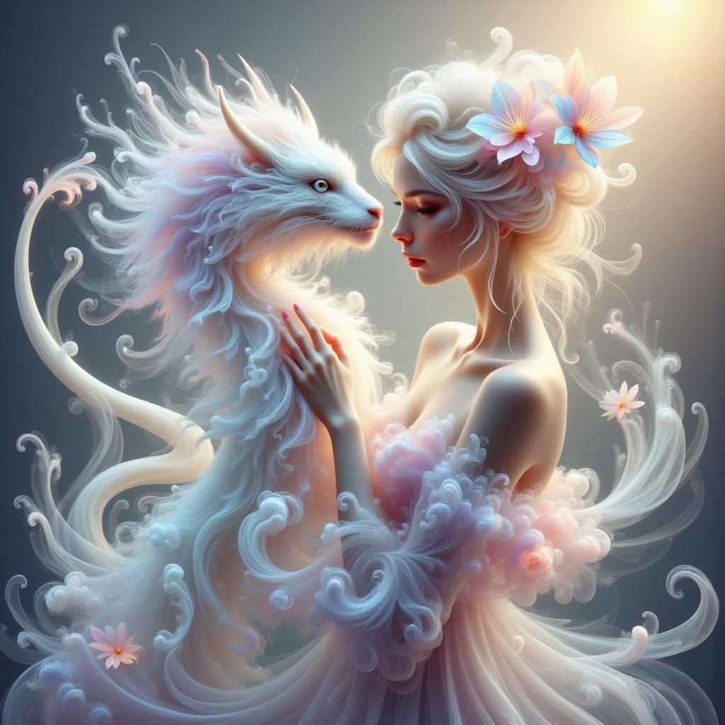 This enchanting image depicts a resplendent fairy gently petting a majestic, bioluminescent dragon amidst a serene, crystal castle backdrop, radiating an otherworldly glow and kaleidoscope of colors in a soft, pastel-hued atmosphere.