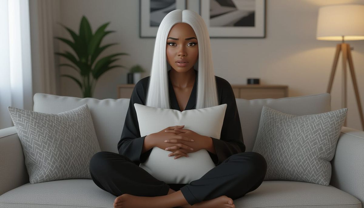 This image shows a young African woman with white hair, wearing black pajamas, clutching a pillow in fear on her couch. Rendered in a dramatic, hyperrealistic animated style with deep shadows and cinematic lighting.