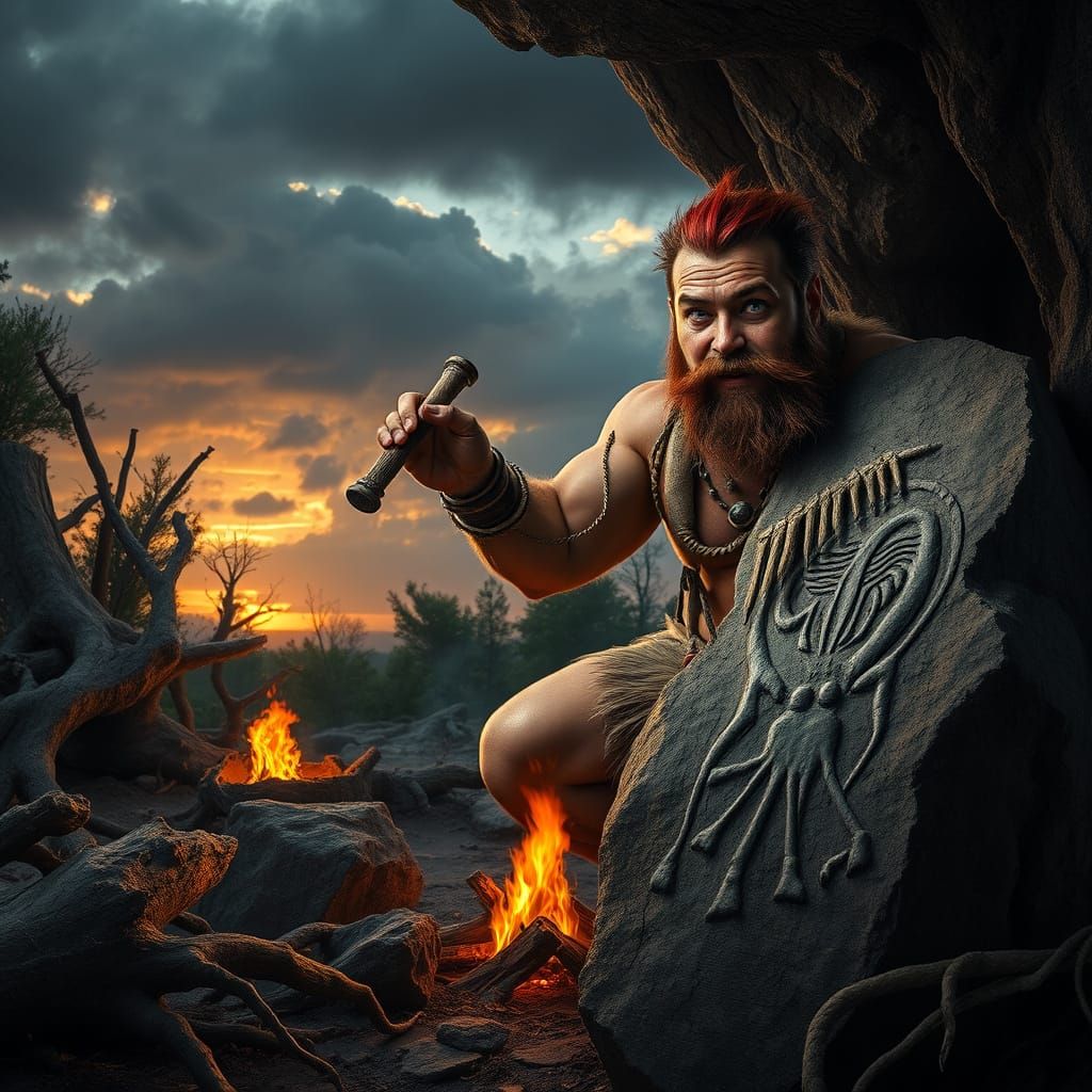 This image shows a bearded man carving an alien image on a rock. The cinematic and hyper-realistic scene features a dark sunset sky, heavy shadows, and dirty textures, creating a dramatic atmosphere.