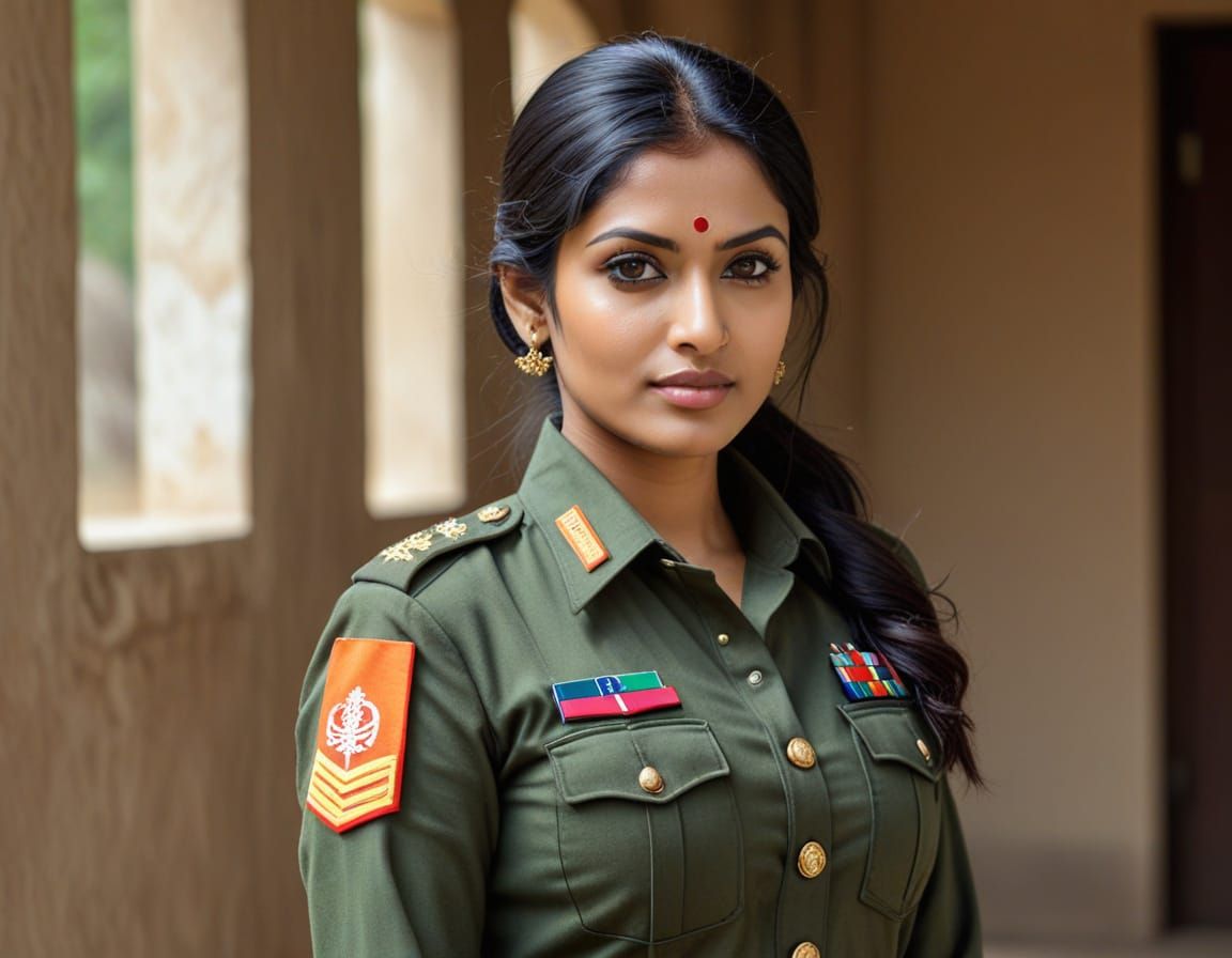 This image shows a beautiful Hindu woman wearing a military uniform. The portrait blends traditional cultural elements with the discipline and strength associated with military service.