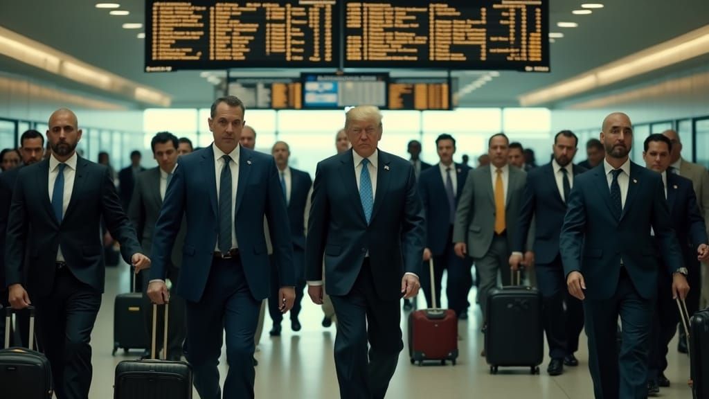 A dramatic scene of politicians walking through airport corridors, surrounded by security and reporters, set against a backdrop of international departure boards, with a cinematic film aesthetic and realistic style reminiscent of film's greatest cinematographers.